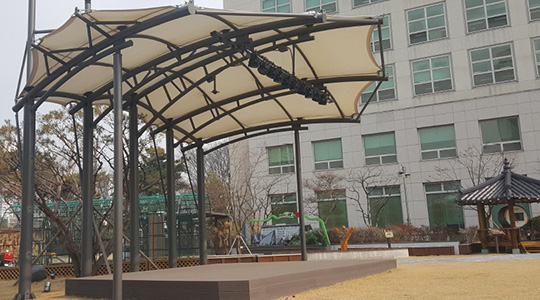 지주대 및 차양막을 부착하여 햇빛을 차단하고우천시에는 빗물을 막아주어 야외활동을 가능하게 하는 구조물로