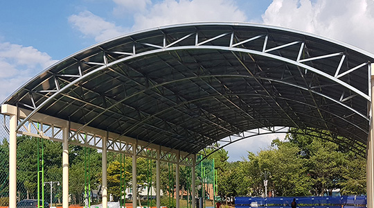 지주대 및 차양막을 부착하여 햇빛을 차단하고우천시에는 빗물을 막아주어 야외활동을 가능하게 하는 구조물로, 건물 출입구, 건물간 연결통로 외 관람석 및 조례대, 스탠드 등에 사용됩니다.