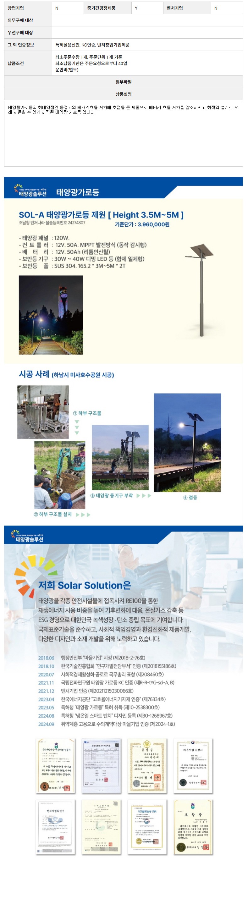 규격 : 램프전력 : 30W~40W 등주높이 : 3.5M~5M 태양광 패널 : 120W 사용램프 : 디밍 LED등 (함체 일체형) 배터리 : 12V · 50Ah (리튬인산철) 컨트롤러 : 12V · 50A · MPPT 발전방식(동작 감시형) 용도 : 가로등